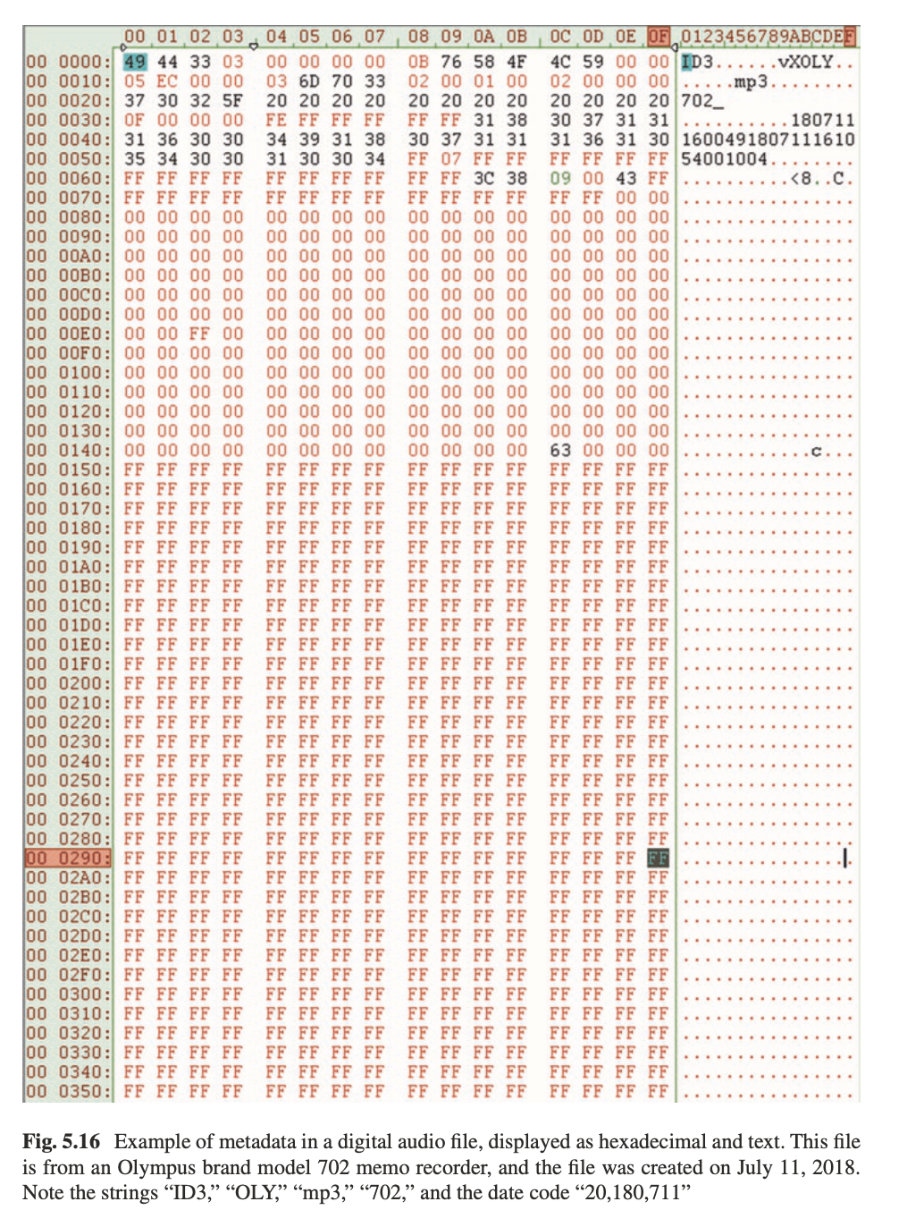 - Internal metadata: embedded in the file container (headers, encoding info, device tags)