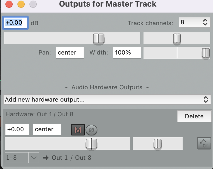 The simples thing you can do with surround mixing in Reaper is to send a mono or stereo track to all speakers. To do this we have to make sure our track and master track are using 8 track channels. Make sure your outputs are set to multi-channel output like so: