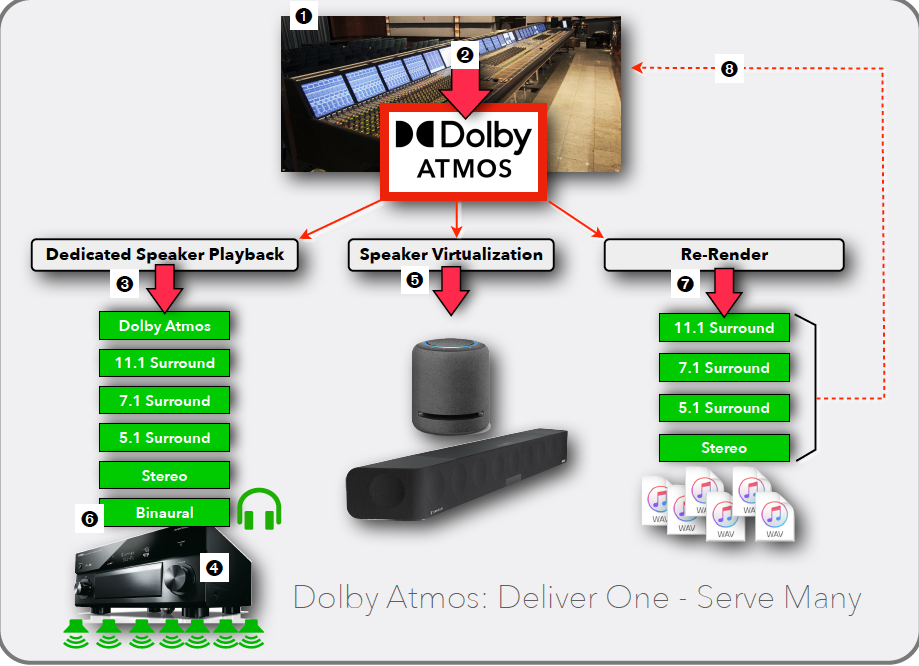 Playback device uses the XYZ information to reproduce the mix on a given set of speakers. AKA