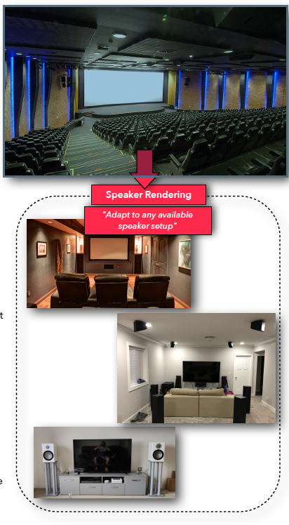 Speaker Rendering: Using the panning data to route the audio signal to the speaker layout of the given room.