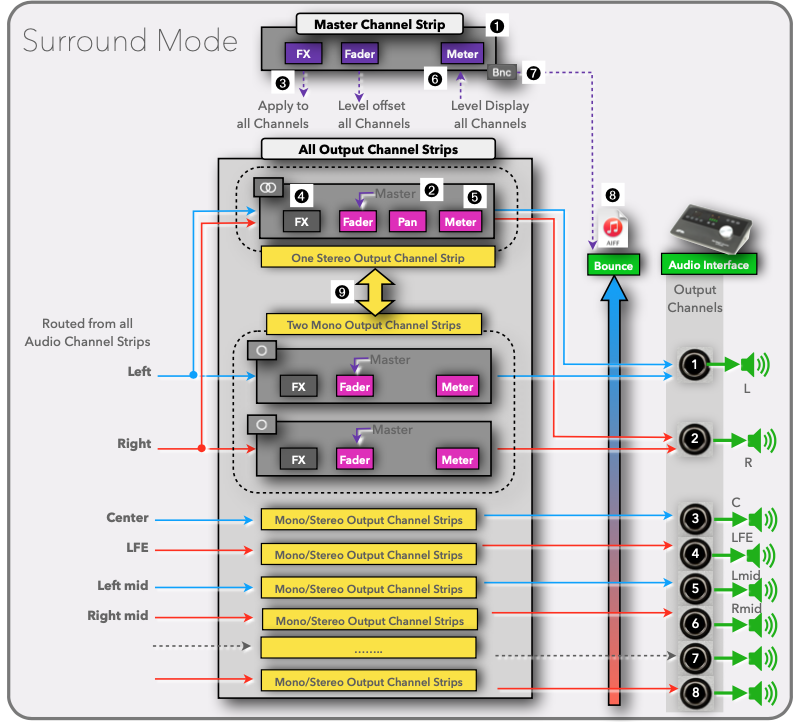Changing the format here will change what each plugin can do. See the surround panner when changing surround formats, the speaker count changes.