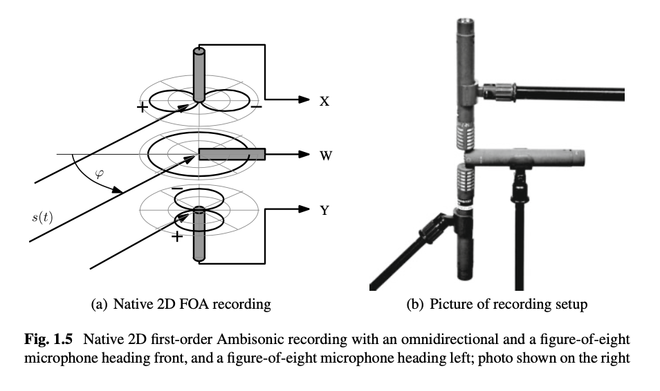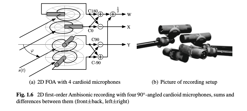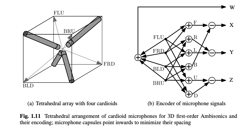 M_front: forward cardioid capturing direct sound.M_rear: backward cardioid providing ambience behind the array.S: side-facing figure-8 that measures left/right pressure differences.Simple matrixing turns these feeds into the horizontal FOA channels: W comes from the sum of M_front and M_rear, X from their difference, and Y from the side figure-8. Adding an up/down figure-8 capsule (Triple MS) contributes the Z channel for full-sphere FOA while keeping the array phase-coincident.