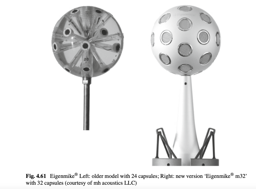 The 32-capsule Eigenmike captures up to fourth-order Ambisonics (25-channel B-format) from a single phase-coincident array.