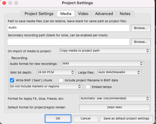 Download the Living in the City mix from Cambridge Multi-tracks. After downloading your project, create a new Reaper project. Configure your project settings to mirror the following: