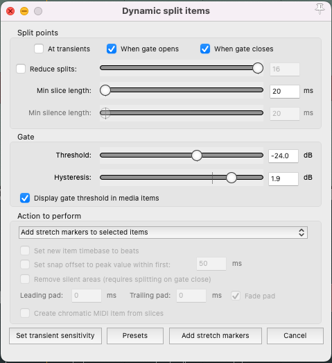 - Under “Action To Perform”, select “Add stretch markers to selected items” from the dropdown menu.