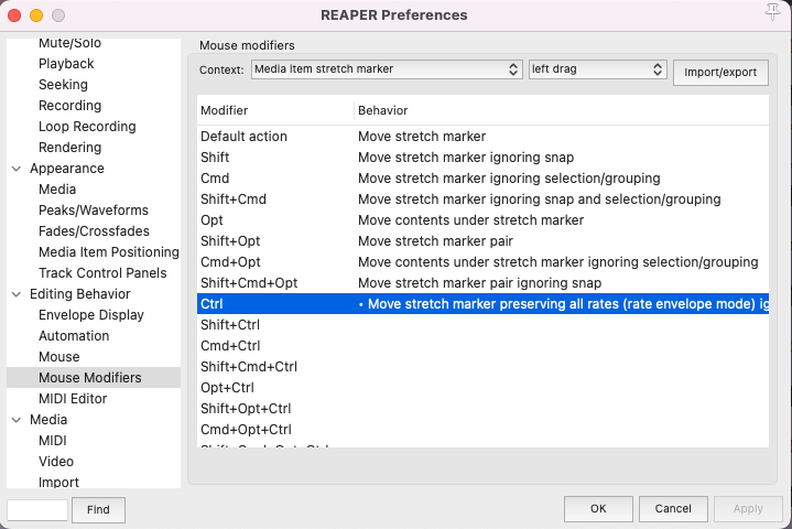 - Context: Media item stretch marker, then set left drag to Move stretch marker