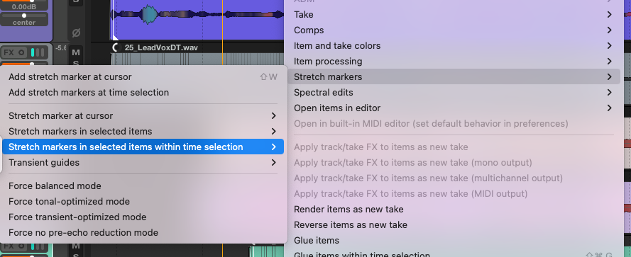 - Select only the double-tracked vocal: Make sure you’ve added stretch markers to this track using Dynamic Split.